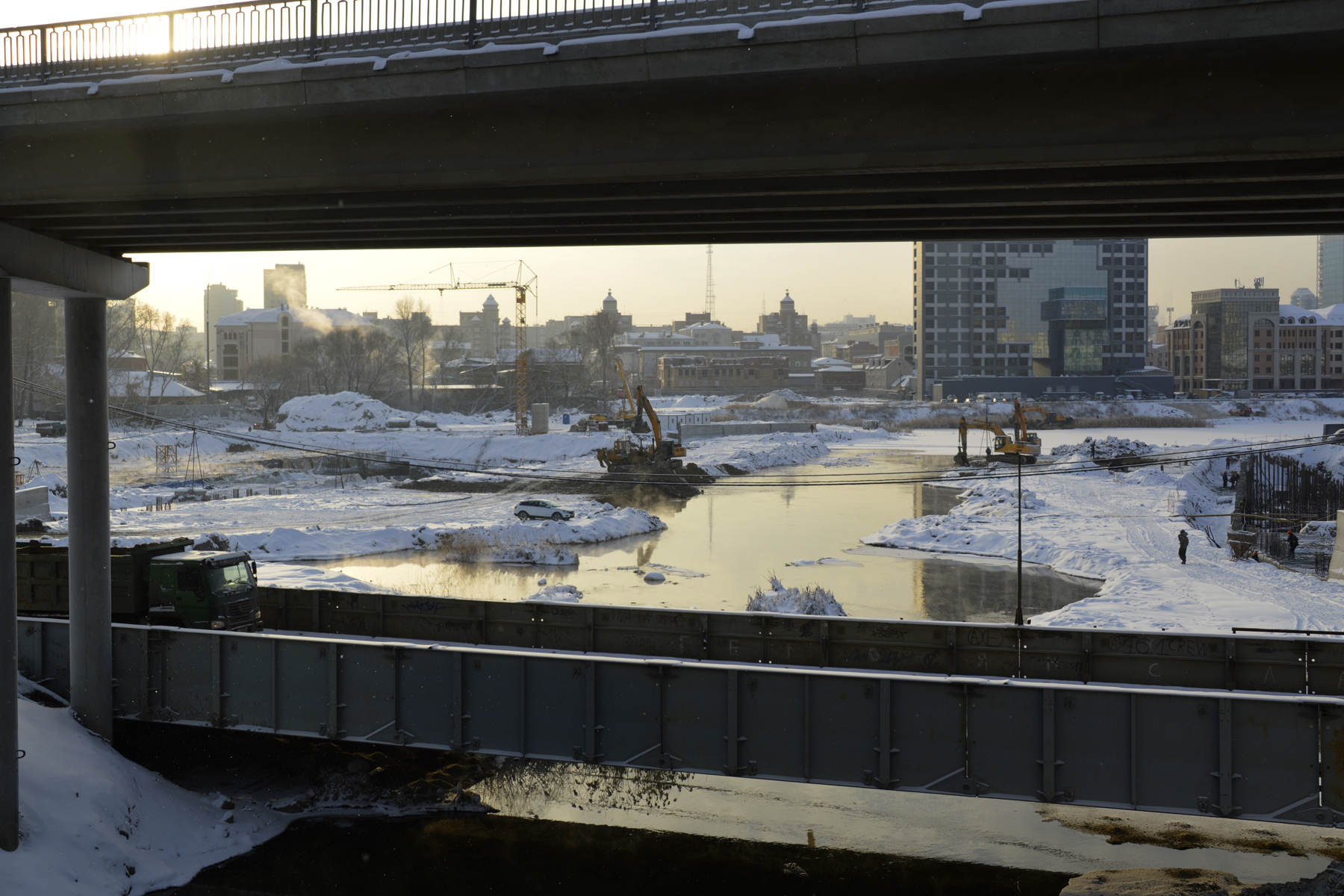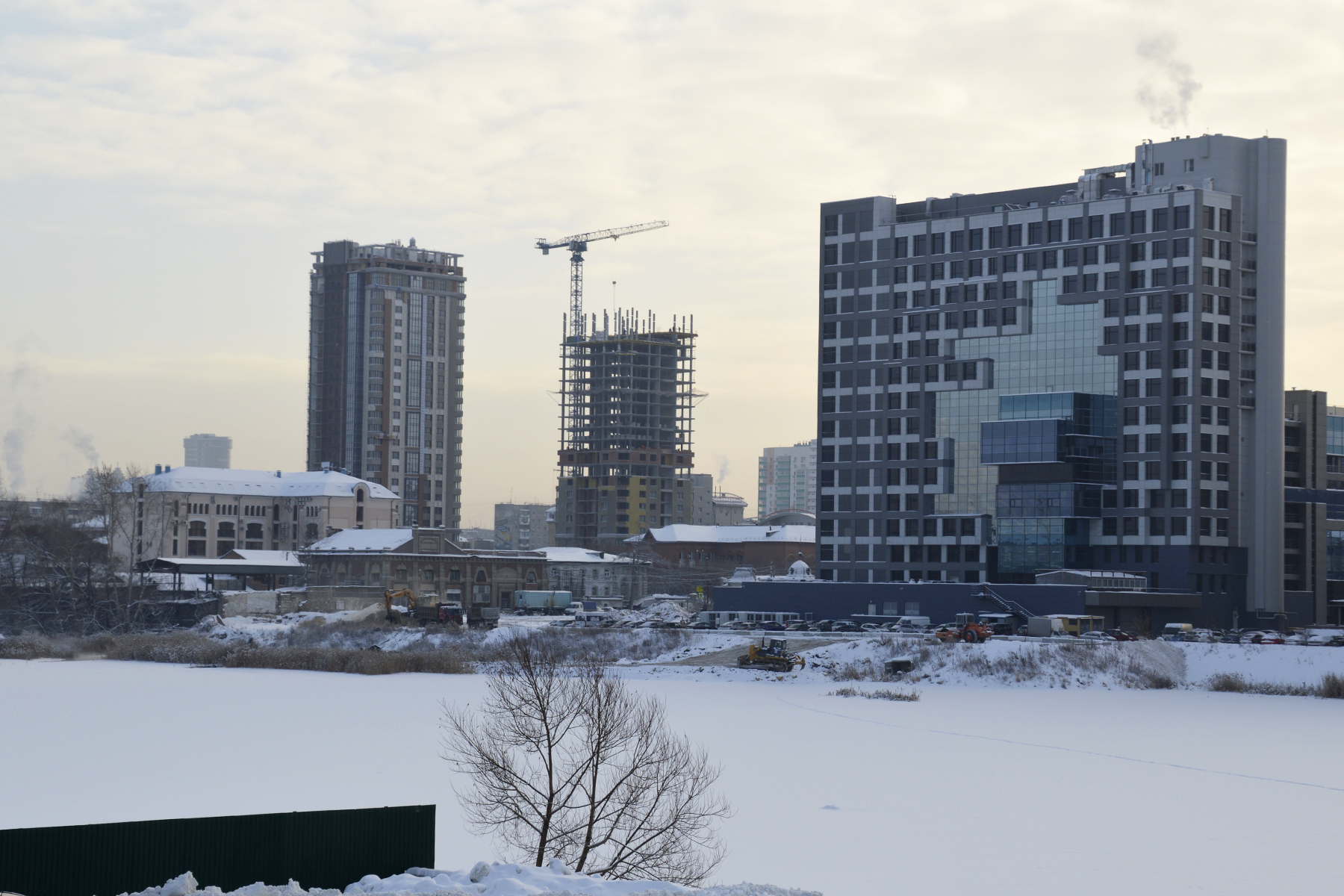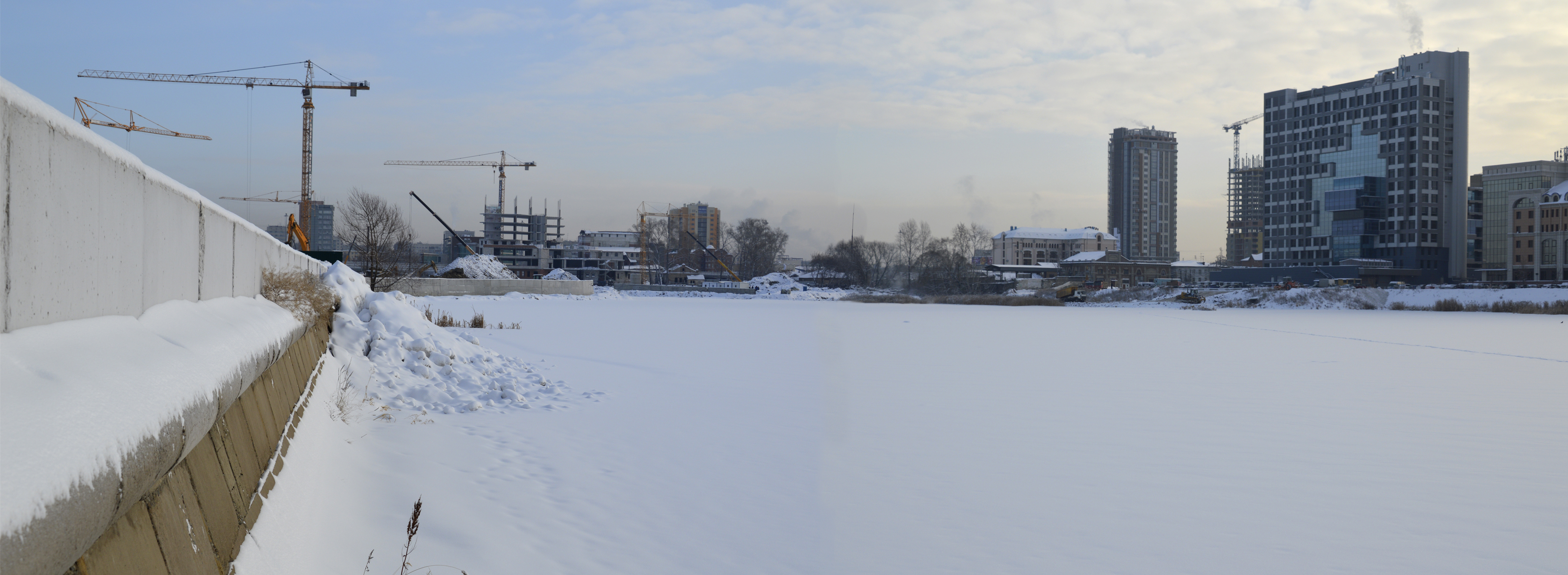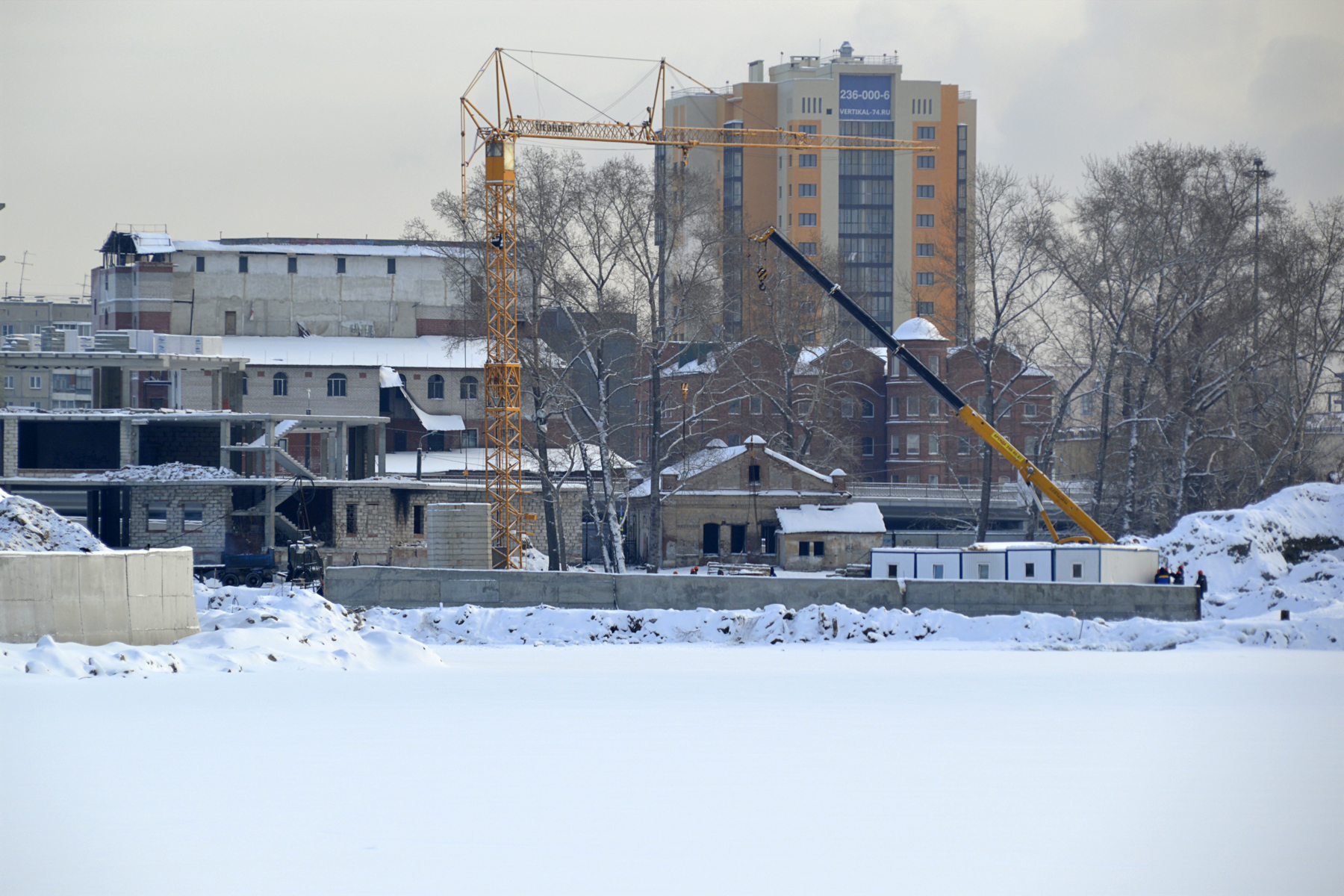 02. Набережная реки Миасс в районе краеведческого музея. Впереди виден мост по ул. Кирова. За мостом виднеется строящийся ЖК "башня свободы", чуть левее БЦ "Ньютон", ещё чуть левее...