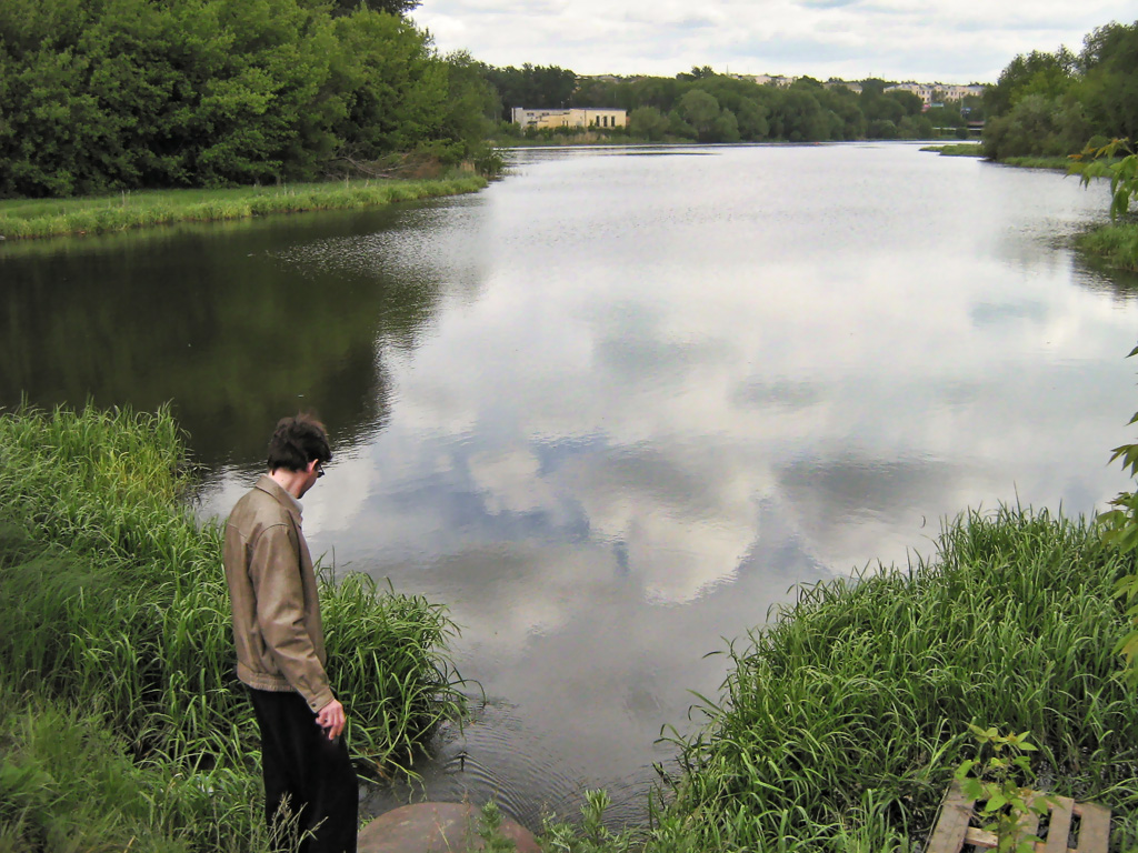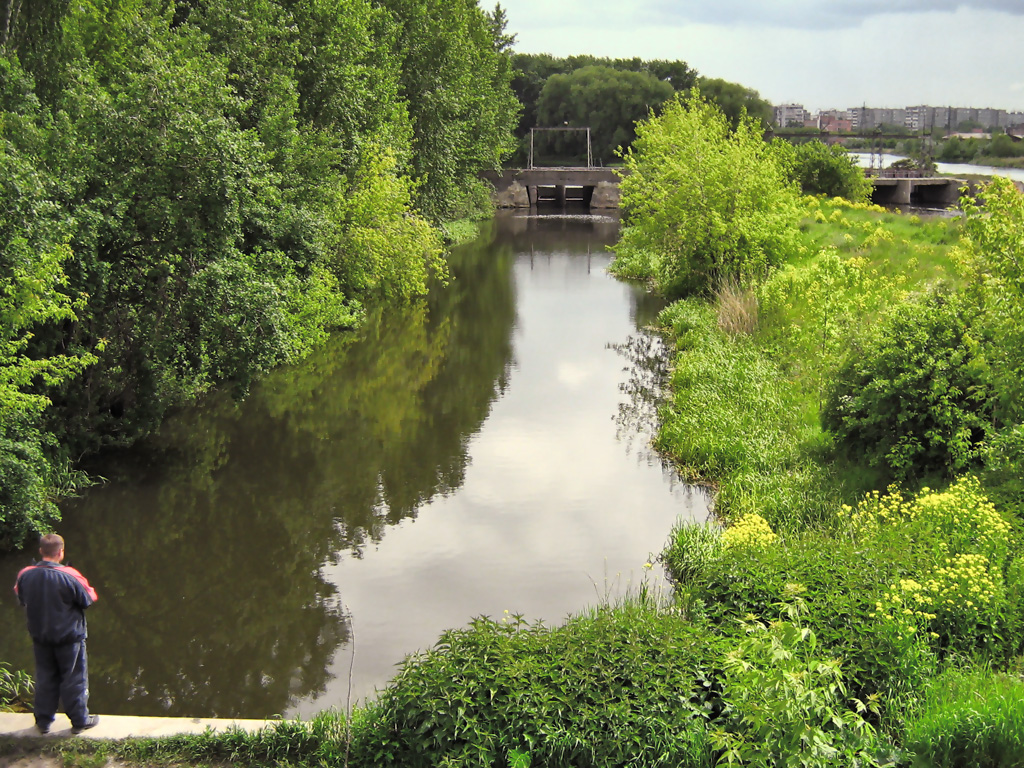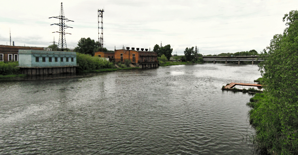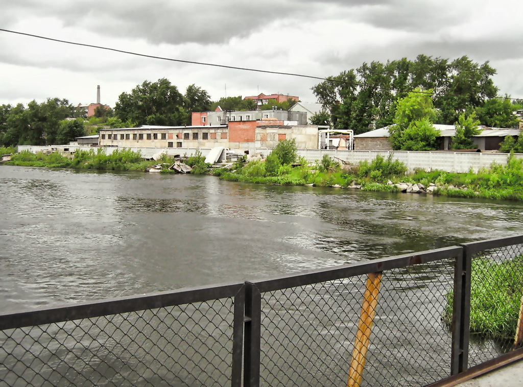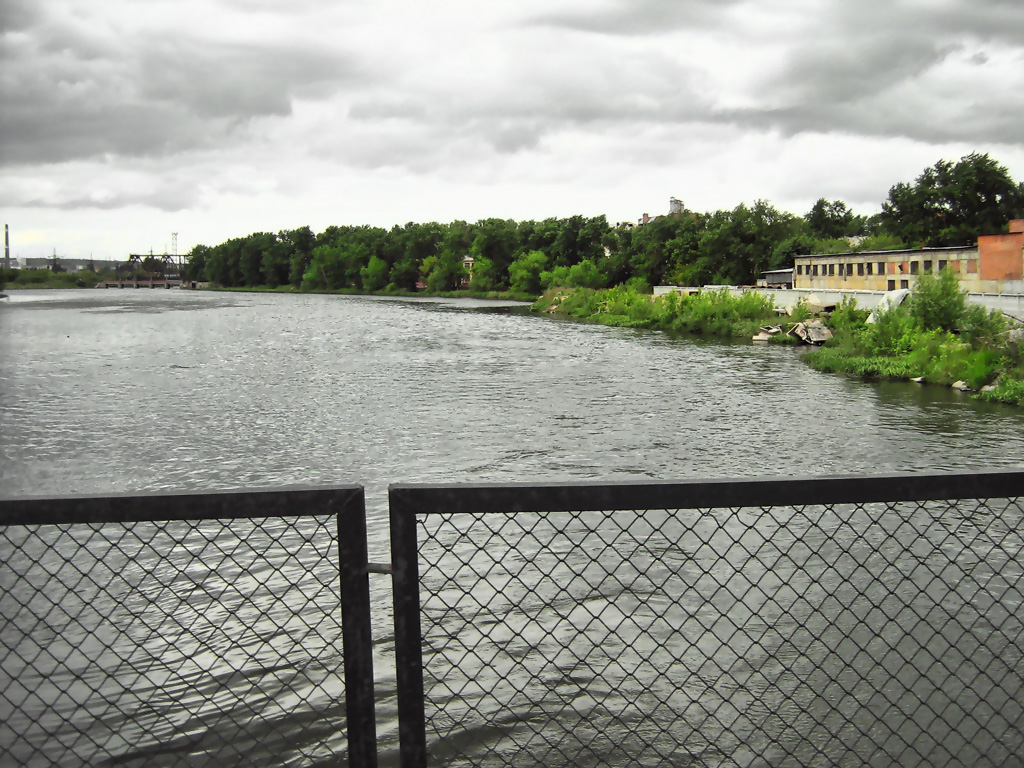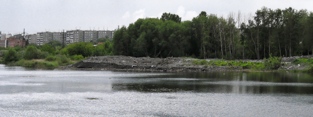 Мрачные берега скрывают много расово познавательного. За деревьями, в частности, хитро заныкан стадион, где авиамоделисты в тот день пускали самолетики. Левее - старая плотина ЧГРЭС. Ходил вокруг много раз, но так и не сообразил, как туда выбраться. Наверное, это очень сильное колдунство.