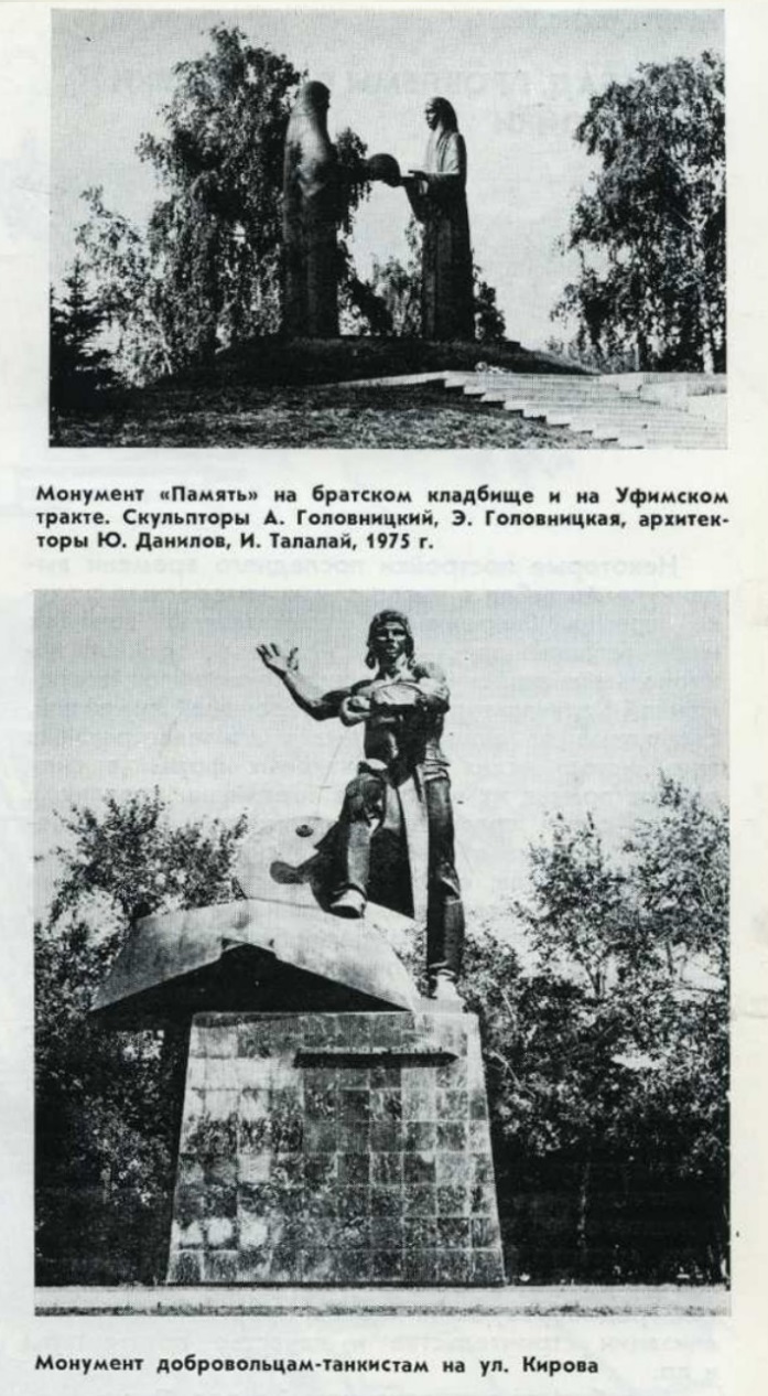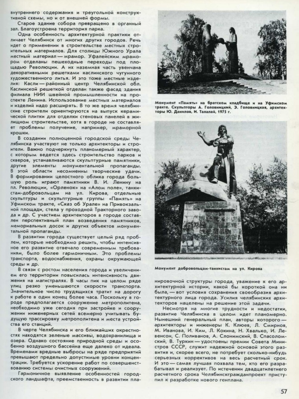 В создании полноценной городской среды Челябинска участвуют не только архитекторы и строители. Важно подчеркнуть планомерный характер, с которым ведётся здесь строительство парков и скверов, устанавливаются скульптурные памятники, другие элементы монументальной пропаганды. В этой области несомненны творческие удачи. В формировании целостного облика города большую роль играют памятники В. И. Ленину на пл. Революции, «Орлёнок» на «Алом поле», танкистам-добровольцам на ул. Кирова, отдельные скульптуры и скульптурные группы «Память» на Уфимском тракте, Сказ об Урале на Привокзальной площади, стела у проходной Тракторного завода и др. С участием архитекторов в городе составлен перспективный план возведения памятников, мемориальных досок и других объектов монументальной пропаганды.