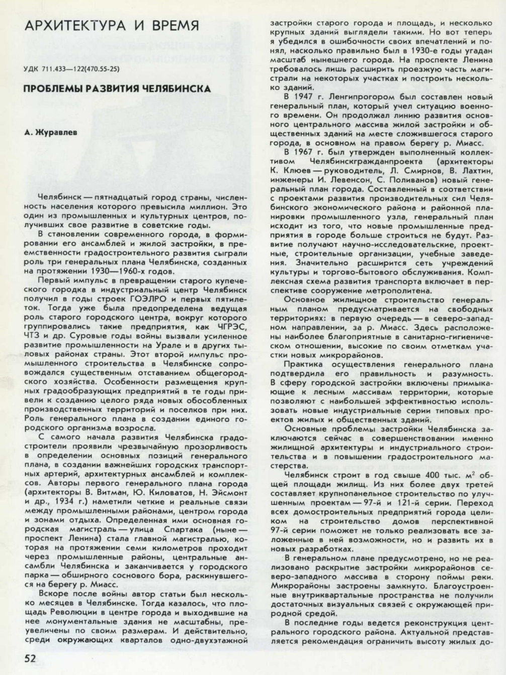 Несмотря на многие трудности и недостатки, развитие Челябинска в целом идёт планомерно. Нынешний генеральный план, авторы которого - архитекторы и инженеры К. Клюев, Л. Смирнов, М. Иванова, И. Ким, Л. Кокина, Н. Хвалько, И. Левенсон, С. Поливанов, А. Слонимский, В. Спасоломский, В. Туркин - удостоены премии Совета Министров СССР, служит надёжной основой этого развития и, скорее всего, не потребует сколько-нибудь серьёзных коррективов на весь расчётный срок. И это - самая лучшая похвала тем, кто его разрабатывал и реализует. По истечении двадцатилетнего расчётного срока Челябинскгражданпроект приступил к разработке нового генплана.
