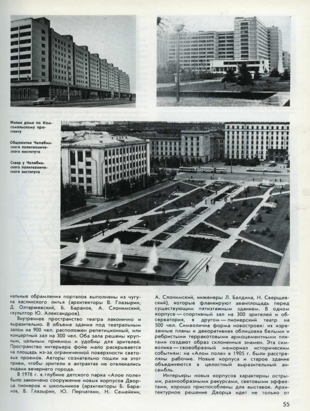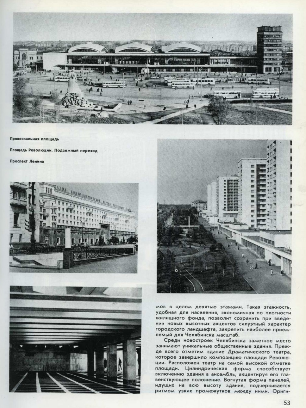 Вскоре после войны автор статьи был несколько месяцев в Челябинске. Тогда казалось, что площадь Революции в центре города и выходившие на неё монументальные здания не масштабны, преувеличены по своим размерам. И действительно, среди окружающих кварталов одно-двухэтажной застройки старого города и площадь, и несколько крупных зданий выглядели такими. Но вот теперь я убедился в ошибочности своих впечатлений и понял, насколько правильно был в 1930-е годы угадан масштаб нынешнего города. На проспекте Ленина требовалось лишь расширить проезжую часть магистрали на некоторых участках и построить несколько зданий.
