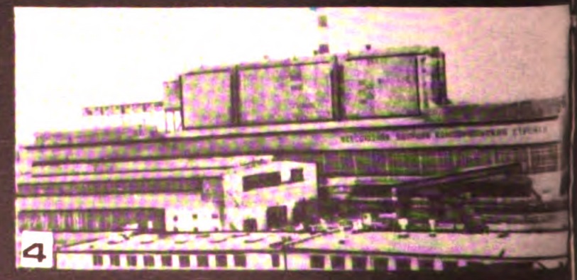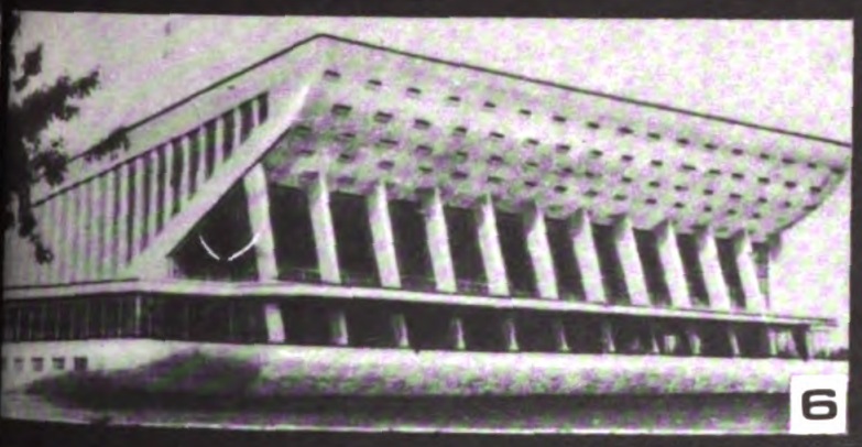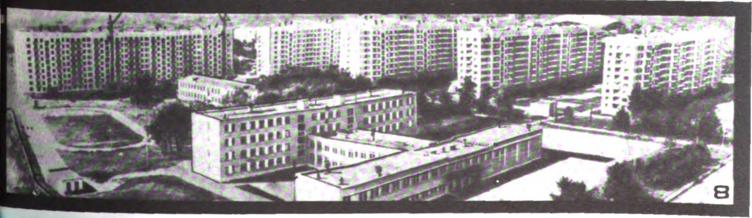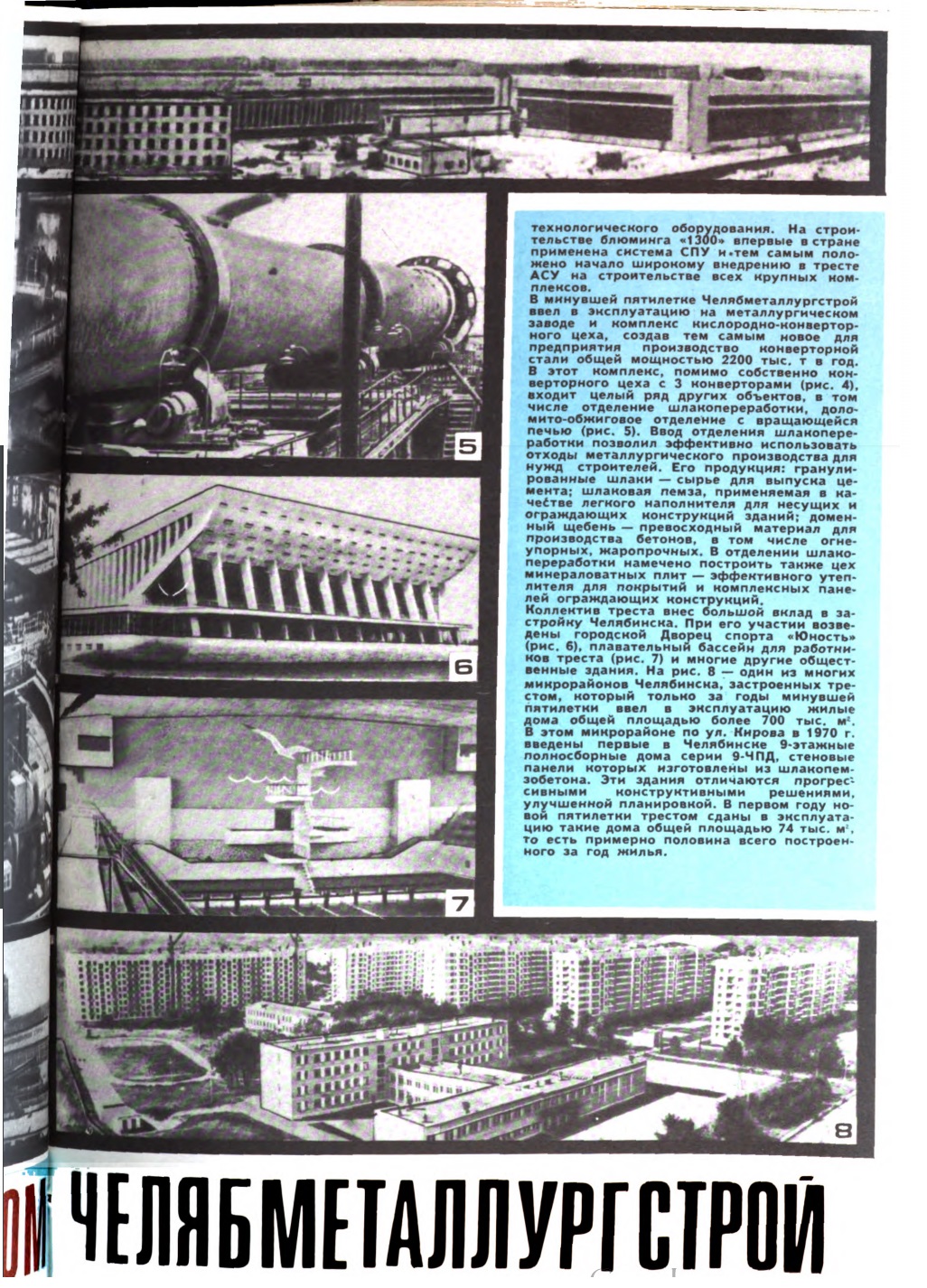 Коллектив треста внес большой вклад в застройку Челябинска. При его участии возведены городской дворец спорта «Юность» (рис. 6), плавательный бассейн для работников треста (рис. 7) и многие другие общественные здания. На рис. 8 — один из многих микрорайонов Челябинска, застроенных трестом, который только за годы минувшей пятилетки ввел в эксплуатацию жилые дома общей площадью более 700 тыс. м². В этом микрорайоне по ул. Кирова в 1970 г. введены первые в Челябинске 9-этажные полносборные дома серии 9-ЧПД, стеновые панели которых изготовлены из шлакопемзобетона. Эти здания отличаются прогрессивными конструктивными решениями, улучшенной планировкой. В первом году новой пятилетки трестом сданы в эксплуатацию такие дома общей площадью 74 тыс. м², то есть примерно половина всего построенного за год жилья.