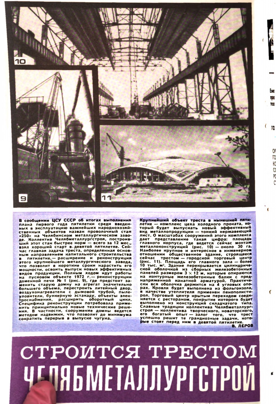 Журнал "На стройках России" № 4, 1972 г. весь посвящён тресту Челябметаллургстрой. Среди инженерно-технических текстов в самом начале имеются фотографии и описания, представляющие интерес для краеведческих изысканий. Особенно это фото - строящийся торговый центр с рядом стоящим троллейбусом (вроде как МТБ-82), переделанным в бытовку. Не помню, выкладывался ли где-нибудь данный снимок.