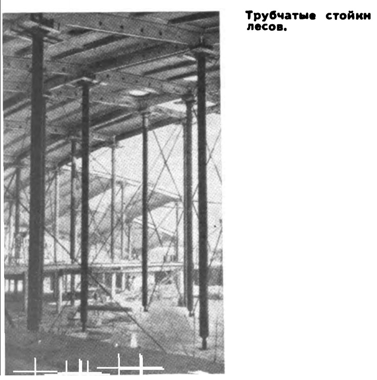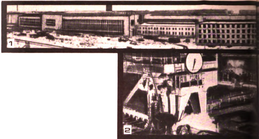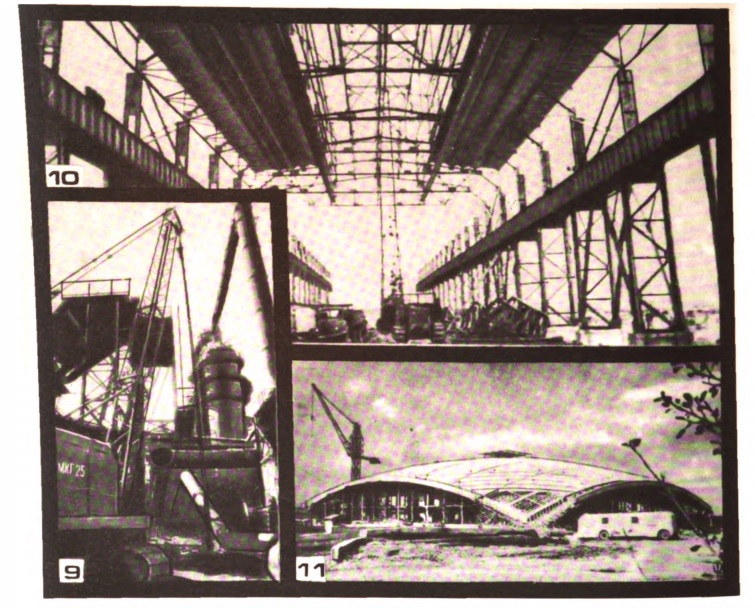 Крупнейший объект треста в нынешней пятилетке — комплекс цеха холодного проката, который будет выпускать новый эффективный вид металлопродукции — тонкий нержавеющий лист. О масштабах сооружений этого комплекса дает представление такая цифра: площадь главного корпуса, где ведется сейчас монтаж металлоконструкций (рис. 10) — около 30 га. Наиболее крупное и интересное в инженерном отношении общественное здание, строящееся сейчас трестом — городской торговый центр (рис. 11). Площадь его главного зала — более 10 тыс. м². Здание перекрывается цилиндрической оболочкой из сборных железобетонных панелей размером 3 х 12 м, которые опираются на контурные железобетонные балки с преднапряженной канатной арматурой. Практически вся оболочка держится на 4 угловых опорах. Кровля будет выполнена из фольгоизола, в качестве утеплителя применен пенополистирол. Торговый центр крытым переходом соединяется с рестораном, покрытие которого будет выполнено из конструкций складчатого типа. Славные традиции коллектива Челябметаллургстроя — коллектива творческого, новаторского, его богатый опыт — залог того, что трест успешно решит те грандиозные задачи, которые стоят перед ним в девятой пятилетке.