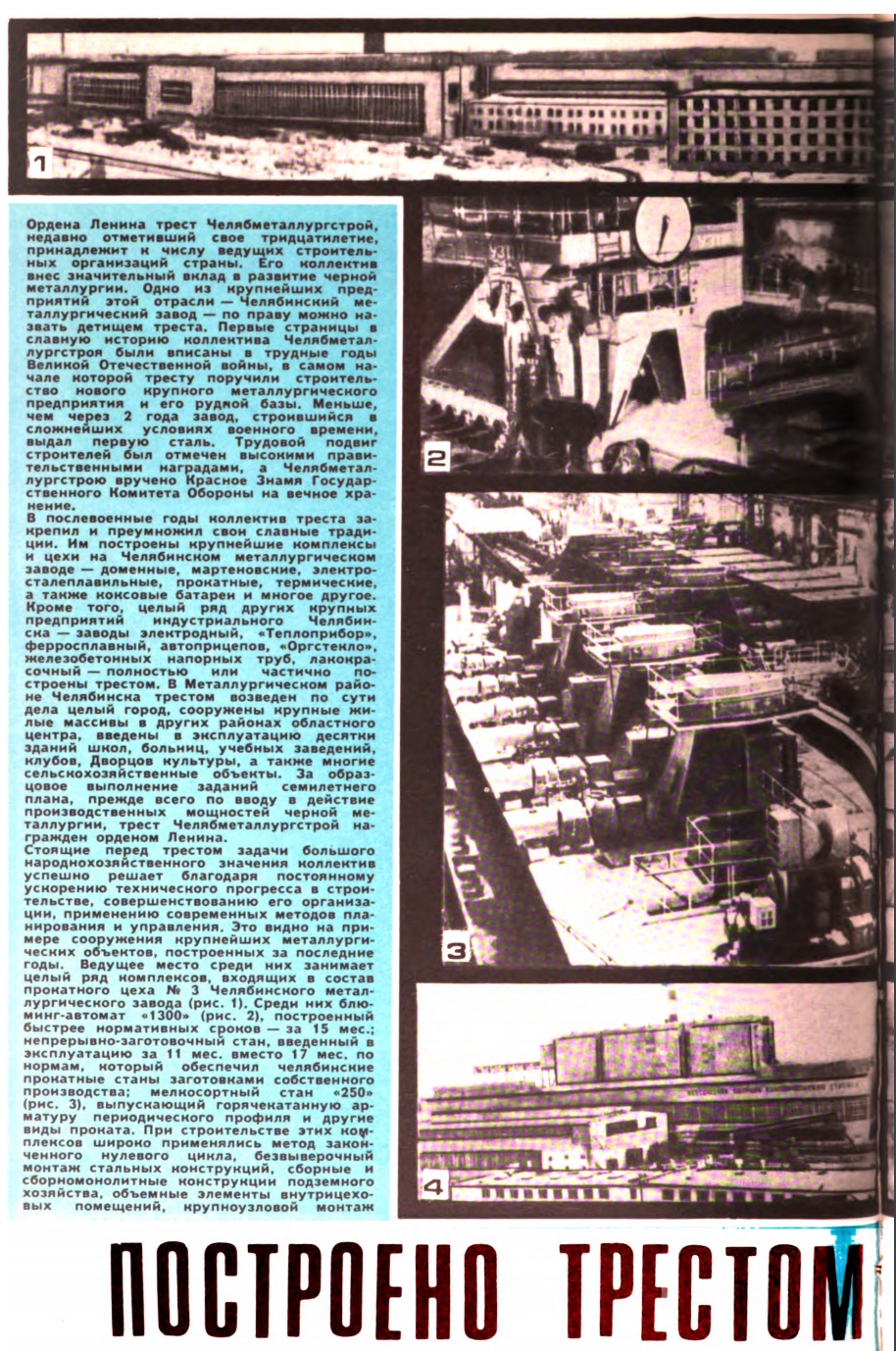 Ордена Ленина трест Челябметаллургстрой, недавно отметивший свое тридцатилетие, принадлежит к числу ведущих строительных организаций страны. Его коллектив внес значительный вклад в развитие черной металлургии. Одно из предприятий этой отрасли — Челябинский металлургический завод — по праву можно назвать детищем треста. Первые страницы в славную историю коллектива Челябметаллургстроя были вписаны в трудные годы Великой Отечественной войны, в самом начале которой тресту поручили строительство нового крупного металлургического предприятия и его рудной базы, меньше, чем через 2 года завод, строившийся в сложнейших условиях военного времени, выдал первую сталь. Трудовой подвиг строителей был отмечен высокими правительственными наградами, а Челябметаллургстрою вручено Красное Знамя государcтвeннoгo кoмитeтa обороны на вечное хранение.